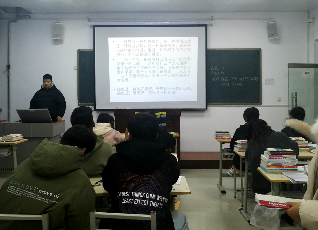 首先各班团支书分享了感恩节的由来以及针对什么是感恩,做了多个层面的解读。接着,同学们上台讲述了各自身上发生的感恩、温暖的事迹。从而让同学们更加懂得感恩的意义,也让大家懂得感恩是对亲人朋友的一种回馈,是一个人所需的品质。带着一颗真诚的心去报答、感谢别人。最后由同学代表上台做总结发言。