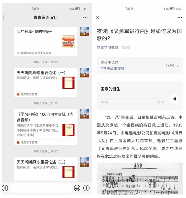 在党员干部中,把认真学习贯彻习近平总书记“七一”重要讲话和来陕考察重要讲话精神作为首要政治任务,鼓励他们学史力行,在服务师生做好事做实事上作表率。在员工中,扎实开展党史学习教育和形势政策教育,引导青年员工坚定理想信念,在学好党史践悟思想上当先锋,在砥砺奋斗成才报国上勇担当,传承红色基因,书写华彩青春!一是继承先烈遗志,传承信仰的力量。广大师生利用手机、电脑等重温9月30日上午在北京天安门广场隆重举行的烈士纪念日向人民英雄敬献花篮仪式。英烈们用鲜血浇灌理想,用生命践行使命,用奉献书写人生,在中华民族的历史长河中构筑起一座座不朽的精神丰碑。广大师生表示,要学习英烈身上的爱国精神、奋斗精神、奉献精神,砥砺奋进、奋发作为,为现中华民族伟大复兴中国梦贡献自己的智慧和力量。二是假期党史学习教育不断线。党总支在公司党员和教工“青青家园”群推送由党史学习教育领导小组办公室指导,人民网.中国共产党新闻网承办的“党史学习教育”公众号文章《中华人民共和国简史》导读及“天天听 毛泽东重要论述”共6期。三是个人自学不放松。党员干部和员工利用“学习强国”学习平台、“渭南互联网+党建云平台” “渭南职院”、渭南职院“团委”、“马院”等公众号进行党史学习。