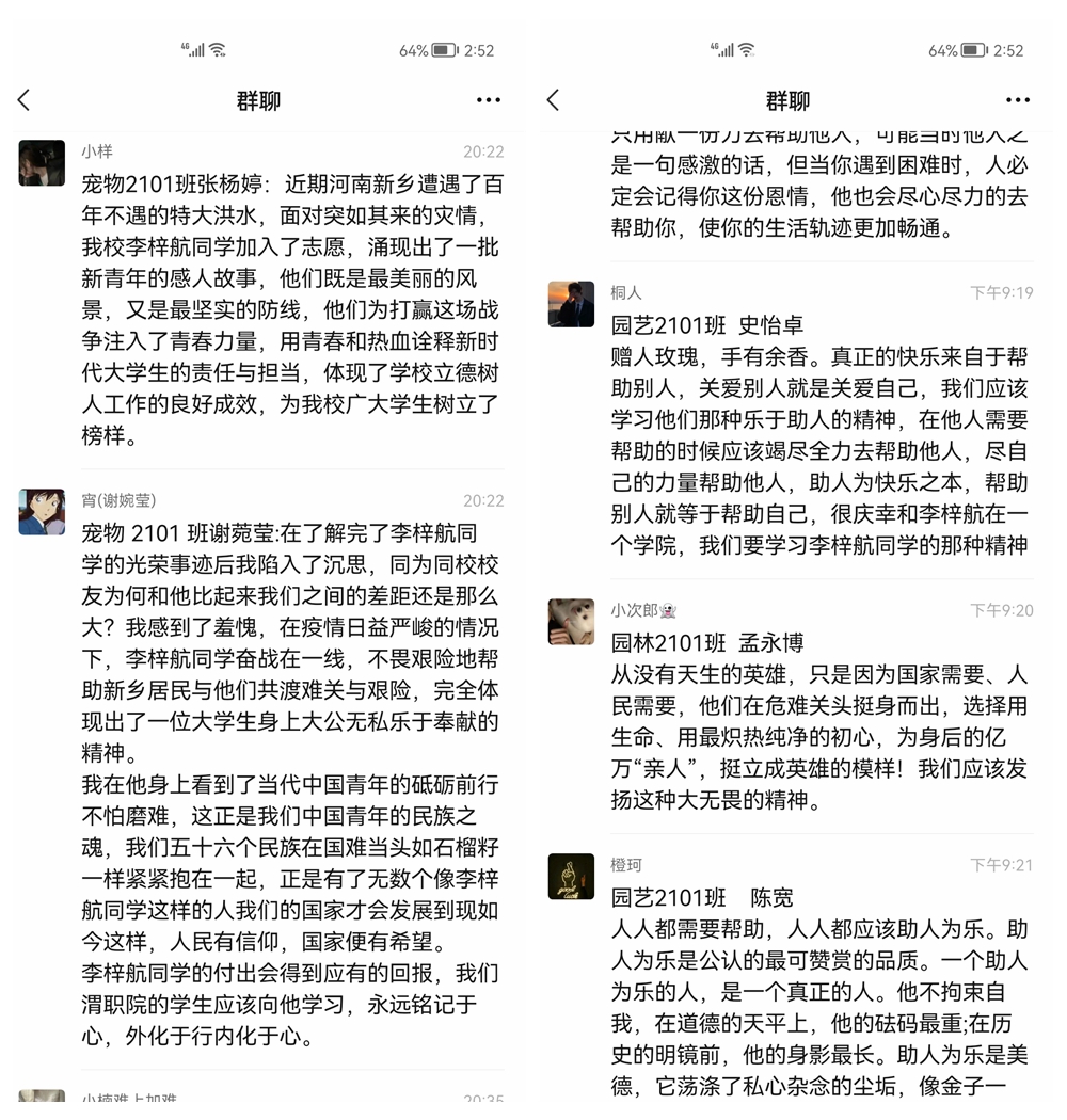 作为当事人,李梓航同学写了一篇文章,标题是《青年有担当 国家有力量 》,表达了自己对家乡和公司的感谢。文章写到,“作为一个新乡市民,作为一名新时代的老员工,在家乡危急时刻,我毫不犹豫地站了出来,自愿参与到了志愿者的队伍当中,义无反顾地投入到保卫家乡的救援中,为家乡抗洪救灾尽自己的一份微薄之力。我觉得自己所做的一切都是应该的,都是微不足道的。”对于家乡和公司的表扬,梓航同学说,“我在欣慰和自豪的同时,觉得很惭愧,因为我只是千百位抗洪抗疫志愿者队伍中最平凡的一位,很多人比我做的更好,更尽力。公司对这件事情这么重视,使我更加坚定了多做好事,多做善事,勤奋学习,苦练本领,服务家乡,回报公司的信心。”同时他号召同学们牢记习近平总书记对广大青年的殷殷重托,争做有理想、有本领、有担当的一代新人。他表示,在今后的学习生活中,要珍惜荣誉,无私奉献,发挥模范带头作用,带动更多的人加入到志愿服务队伍中来,为公司增光,为家乡添彩。要不负韶华、勤奋学习,把小我融入大我,同人民一道拼搏、同祖国一道前进,服务人民、奉献祖国。让青春在为祖国、为人民、为民族的奉献中焕发出绚丽光彩!