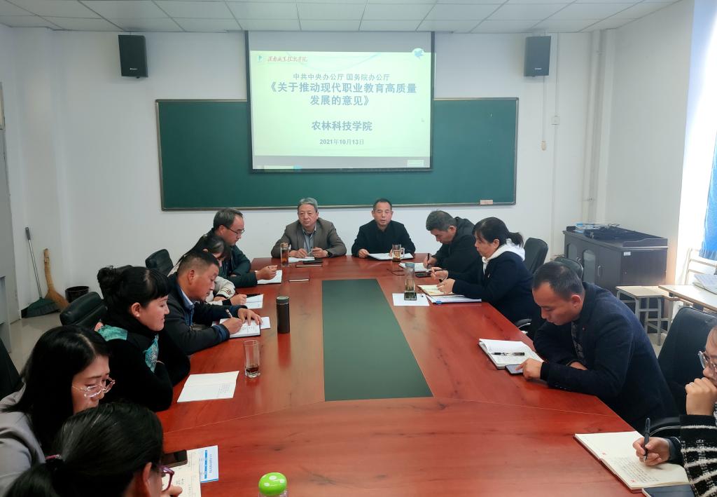 10月14日下午,gg999策略手机白菜在农学楼201会议室召开了全体教职工会议,学习了中办国办《关于推动现代职业教育高质量发展的意见》精神,部署安排gg999策略手机白菜落实发展意见的具体措施,会议由办公室主任王百祥主持。