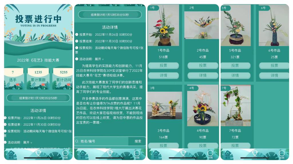 此次大赛分设中国传统插花和现代花艺两个大类15个项目,参赛员工来自园艺技术专业、风景园林专业。赛前园艺技术教研室的老师们精心准备,积极组织员工报名备赛,全体师生员工积极、踊跃配合参与。经过紧张、激烈的初赛,最终有7名选手入围决赛。决赛采用线上投票形式,全校师生共同参与。截至发稿,已累计参与投票1235人次。