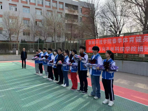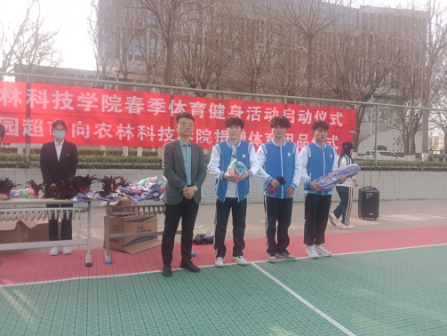 启动仪式上,罗峰、张小青、牛文妍、袁新分别向gg999策略手机白菜各年级各班、员工会集体和团总支集体颁发了鸡毛毽子、提绳、羽毛球拍套装等体育健身用品。现场气氛热烈,掌声不断。