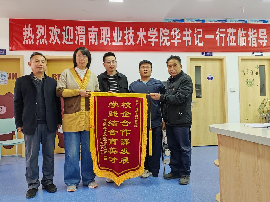 华惠民向动物医院赠送了一面印有“校企合作谋发展,学践结合育英才”的锦旗,并代表公司、杨强强及其家人向企业表示衷心感谢,希望同学们学好专业知识、坚定信心、服务好企业,用优异的成绩回报社会的关心与支持,用实际行动传递爱心,成长为社会的有用人才和家庭的顶梁柱。