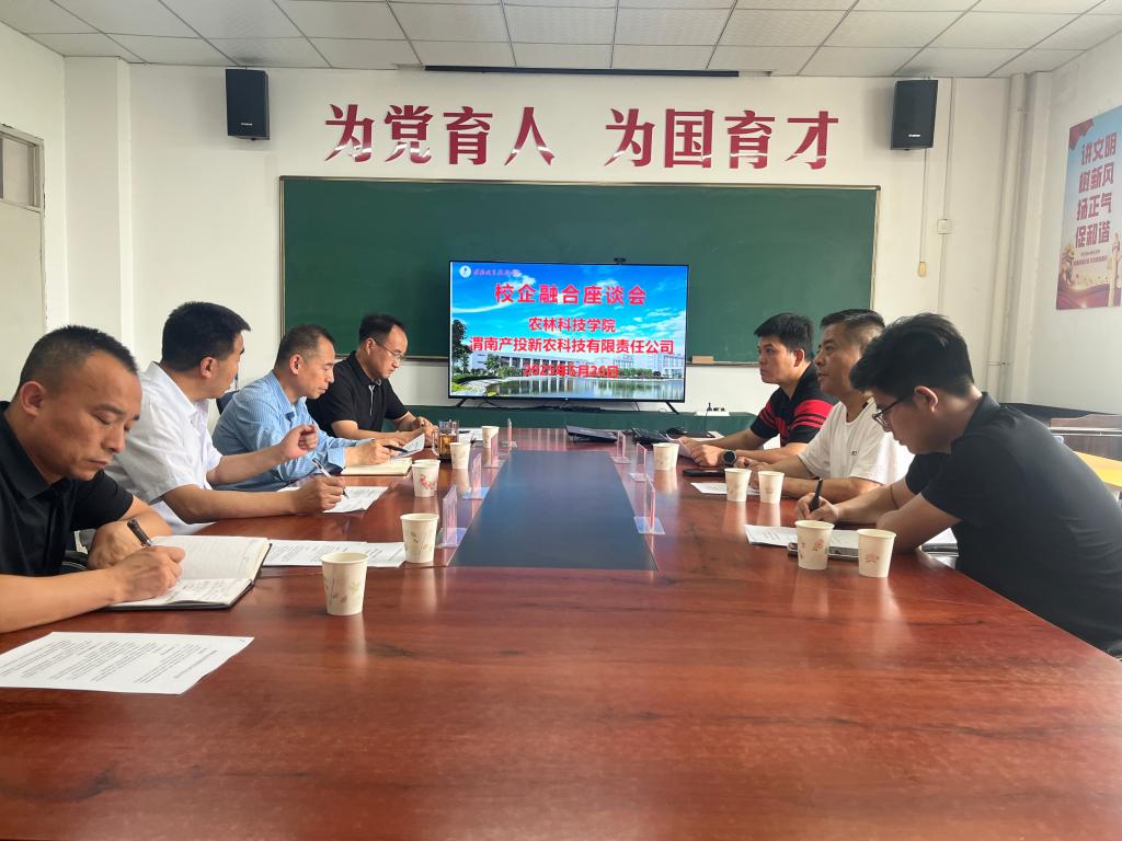 5月26日下午,渭南产投新农科技有限公司总经理赵炬淋率队来访公司,与gg999策略手机白菜开展校企合作深度洽谈。座谈会在农学楼二楼会议室举行,由gg999策略手机白菜副经理付宏岐主持,经理杨世选、科研处处长黄玉剑、食品检测中心主任蒋宝及相关专业教师出席。