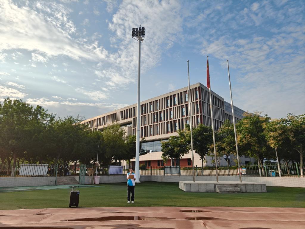 师生队列严整、精神抖擞,在庄严肃穆的氛围中静待升旗仪式启幕。七点整,升旗仪式正式开始,国旗护卫队队员们迈着铿锵有力的步伐,以标准的队列动作护送鲜艳的五星红旗步入升旗台前。全场师生肃立致敬,目光聚焦国旗,神情庄重,心中满怀对祖国的深沉热爱与崇高敬意。