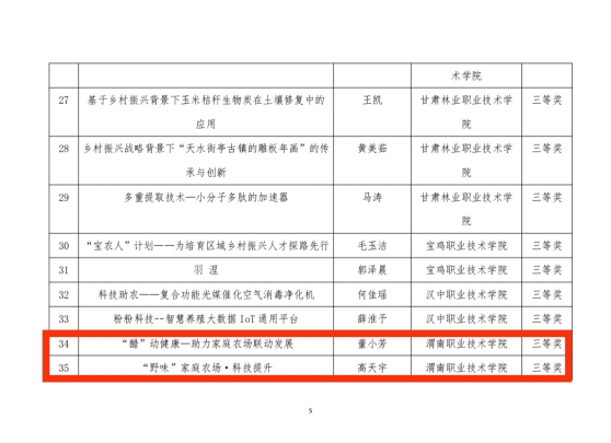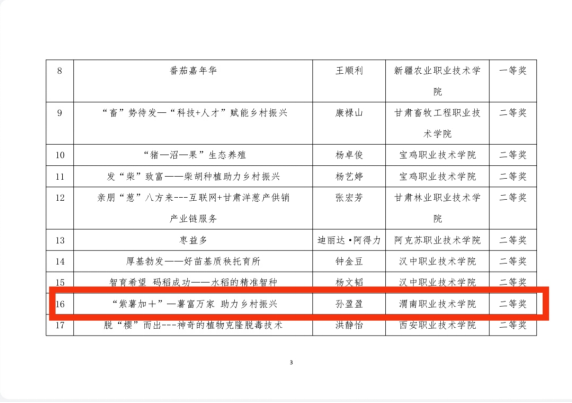 在“农科杯”全国“互联网+”现代农业创新创业大赛中,由赵婷峰等教师指导的孙盈盈同学的《“紫薯加+”—薯富万家 助力乡村振兴》项目荣获二等奖;由高红芳等教师指导的董小芳同学的《“醋”动健康—助力家庭农场联动发展》、由杨玉娜等教师指导的高天宇同学的《“野味”家庭农场·科技提升》2个项目荣获三等奖。