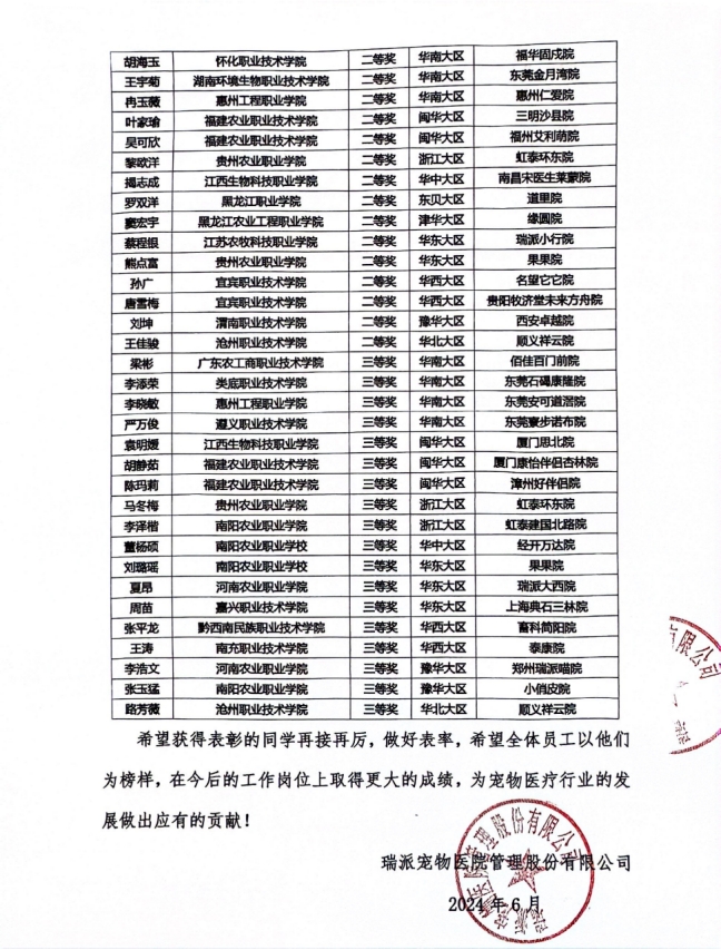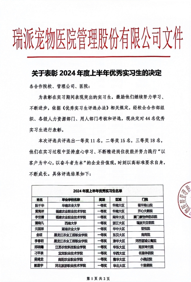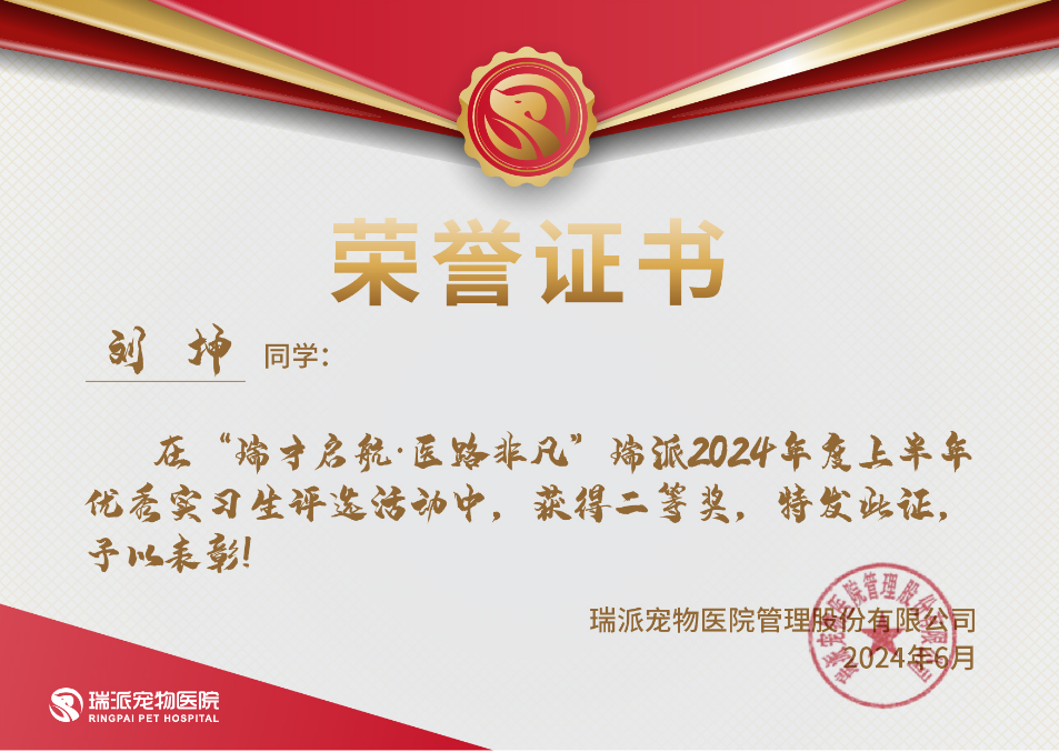 近期,从瑞派宠物医院管理股份有限公司传来喜讯,公司员工刘坤被企业评为“优秀实习生”,获二等奖。瑞派宠物医院管理股份有限公司是公司传统的校企合作企业,此次在全国合作院校、管理公司、医院开展优秀实习生评选活动,公司实习生刘坤凭借出色的专业能力和积极的工作态度,获此荣誉,既是对刘坤同学个人能力的认可,也是企业对公司人才培养质量的肯定。